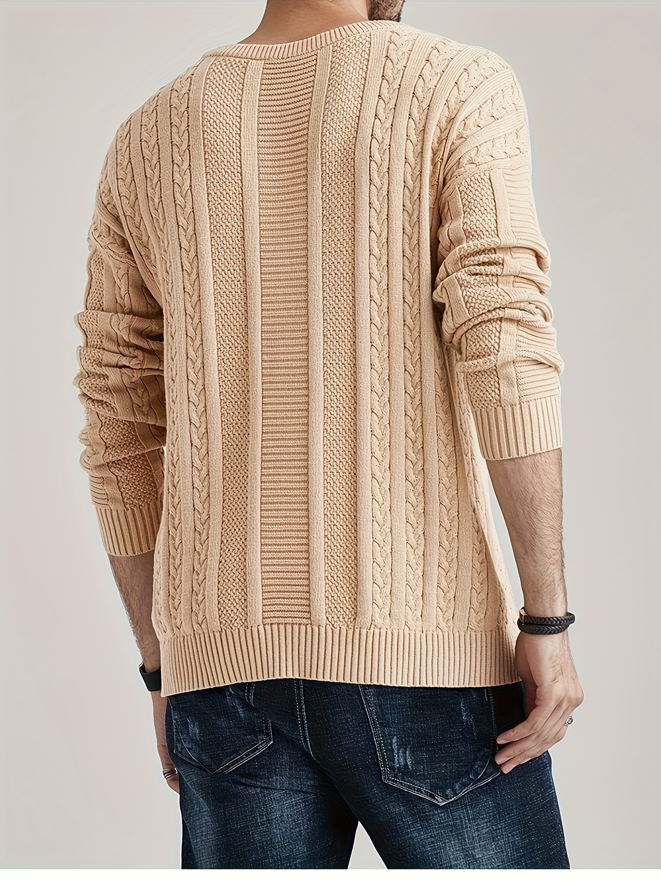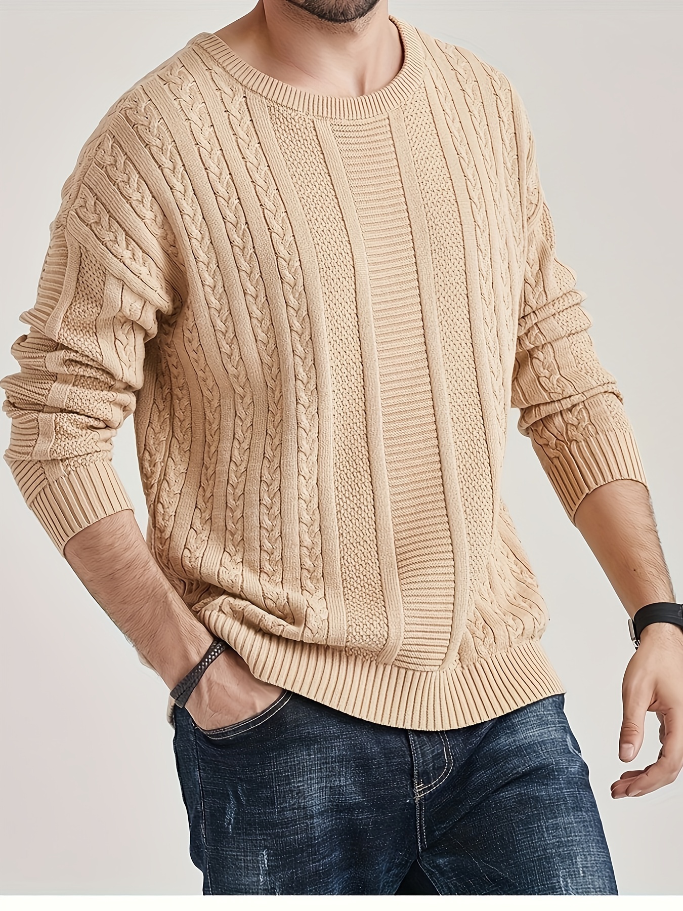 Men's Fashion Long Sleeve Cable Knit Pullover Sweater, Loose Fit Khaki Sweatshirts, Fall Winter Men's Clothing