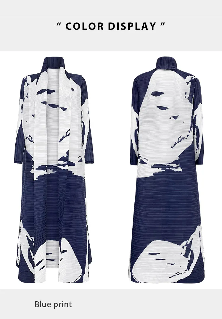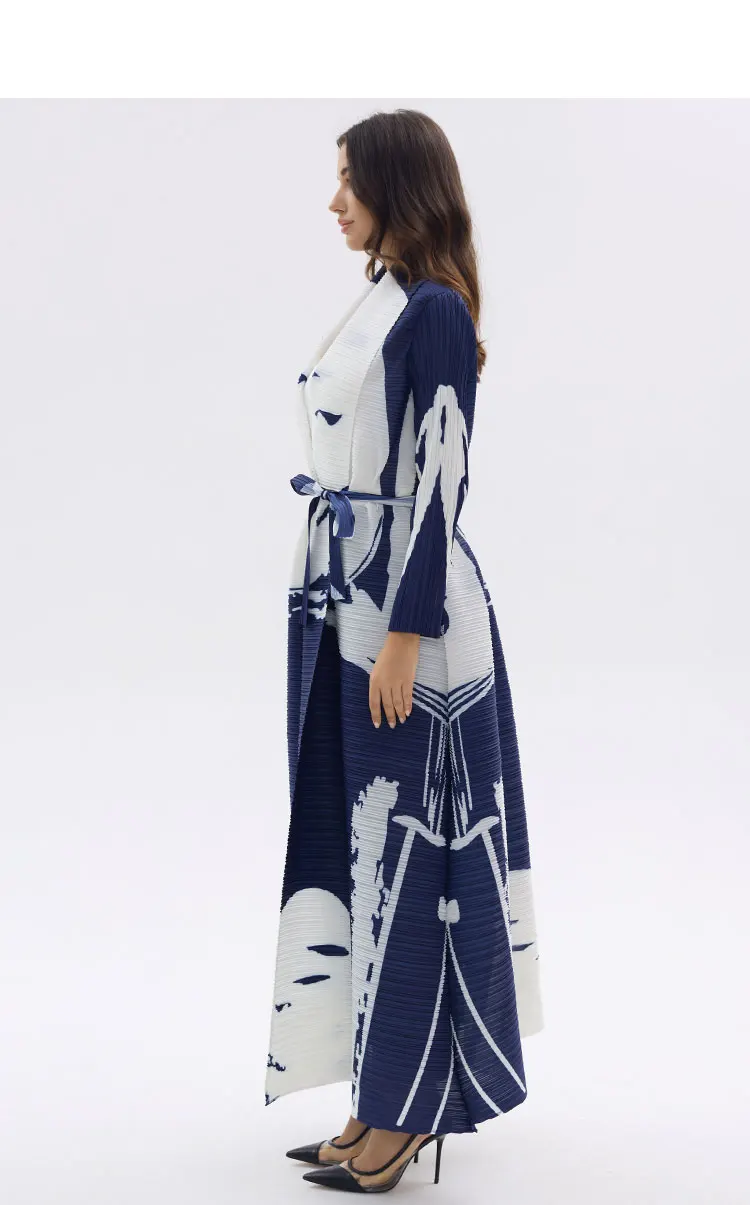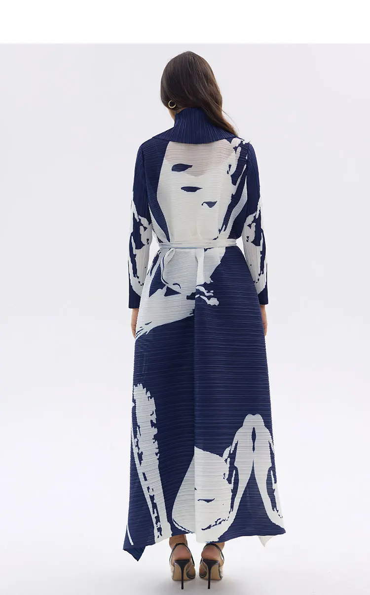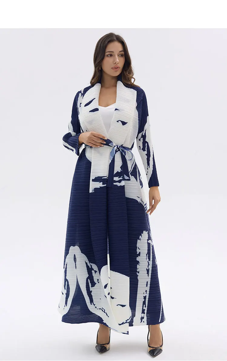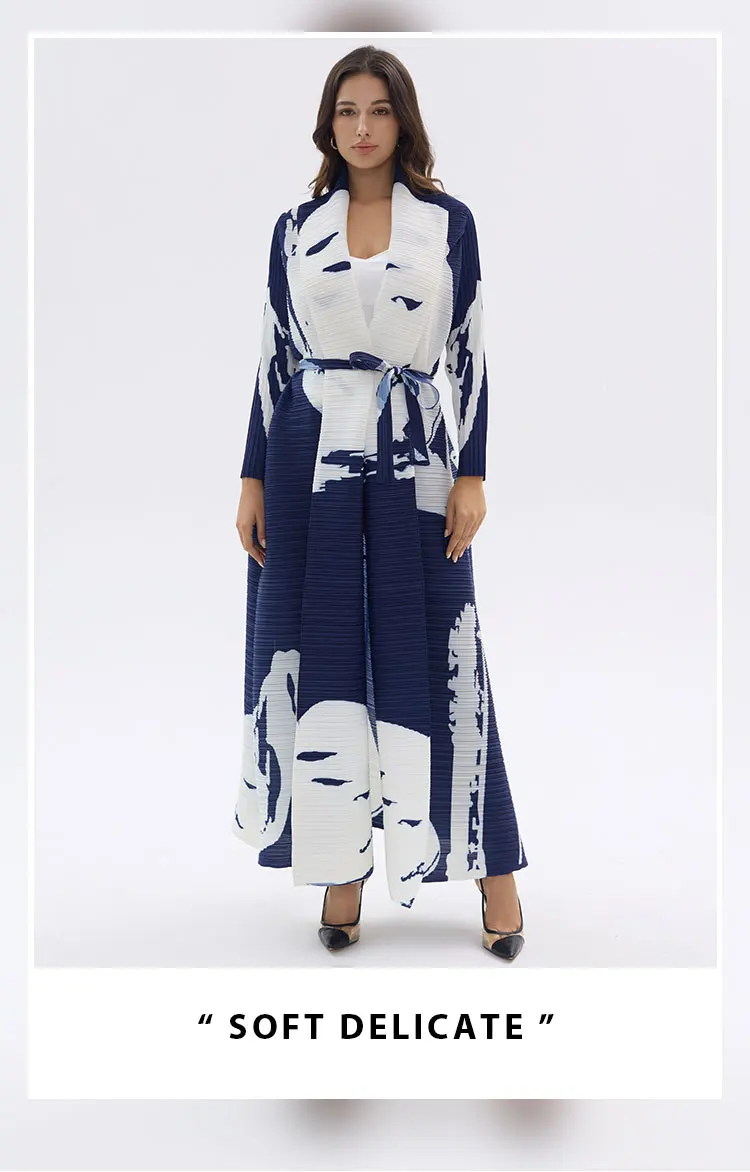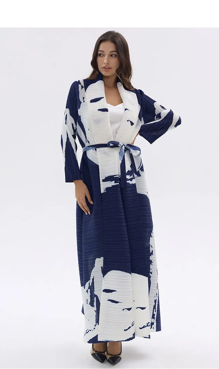 Miyake Pleated Long Sleeve Printed Dress Windbreak Women 2024 Winter New Original Designer Abayas Turndown Collar Belted Coats