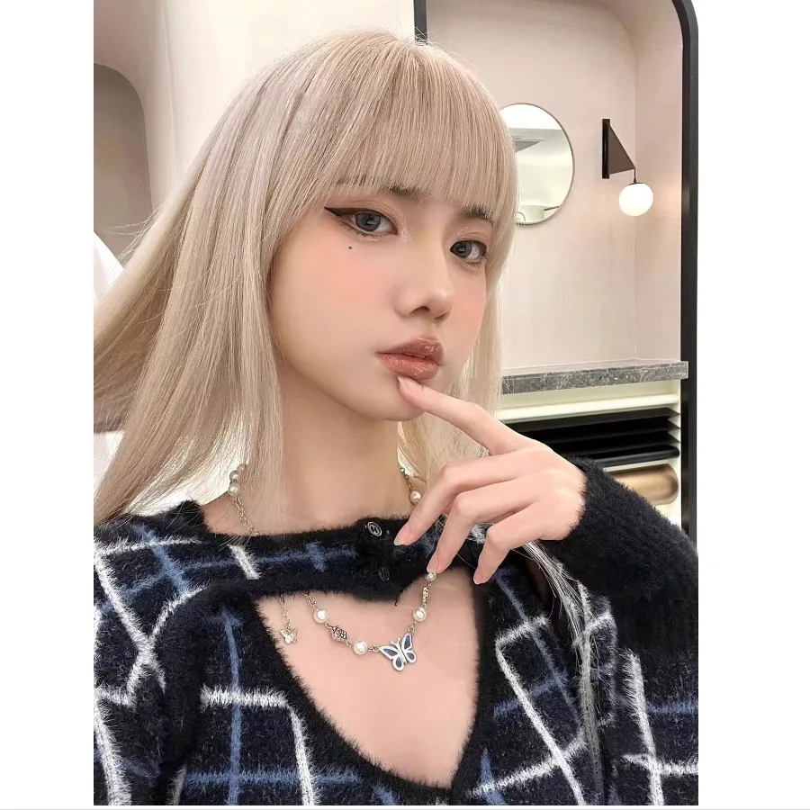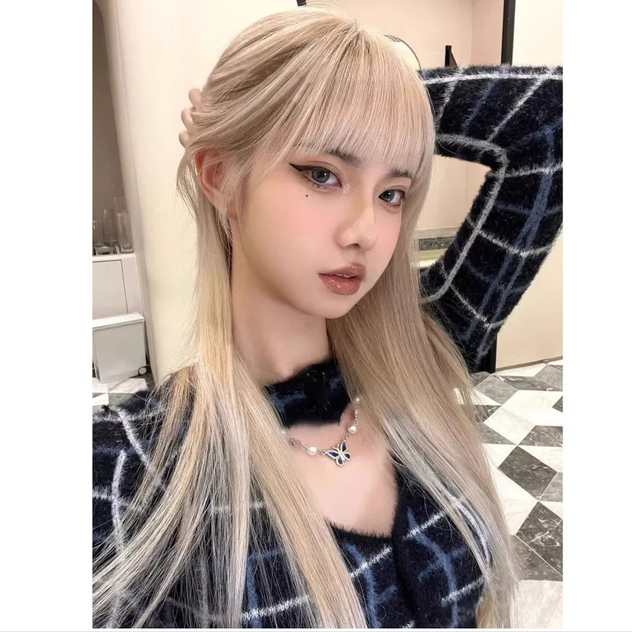 White Blonde Synthetic Wig Women Show White Natural Age Reduction Bangs Soft All-Match Style Long Straight Hair Full Head Cover