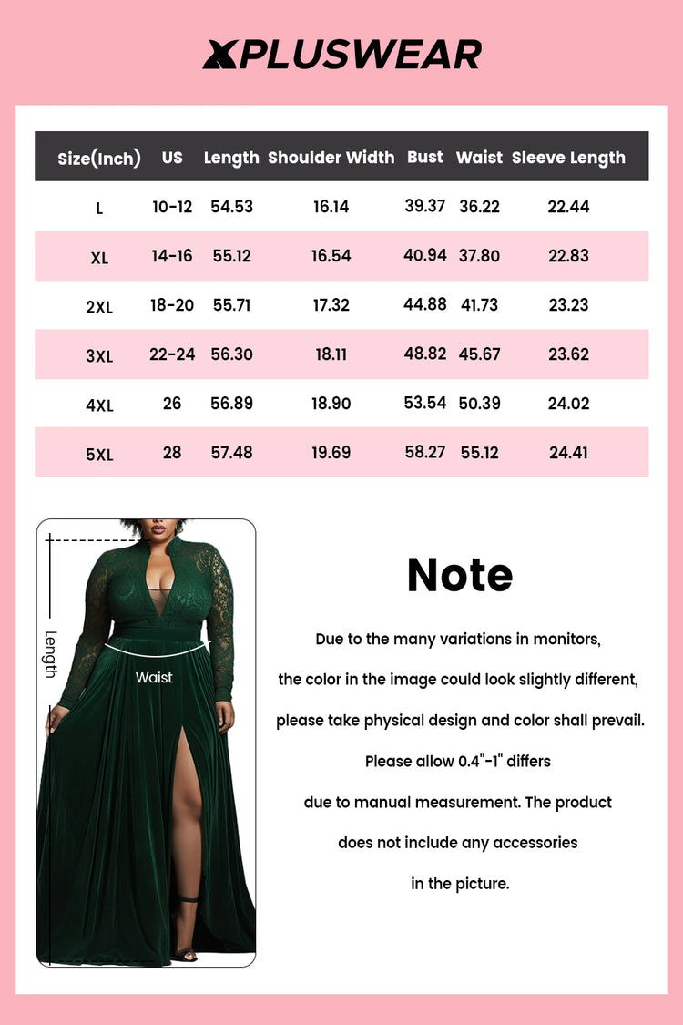 Emerald Green V Neck Long Sleeve Split See Through Lace Velvet Maxi Dress