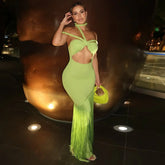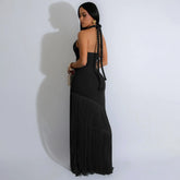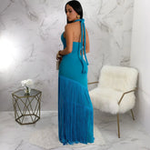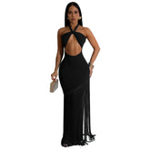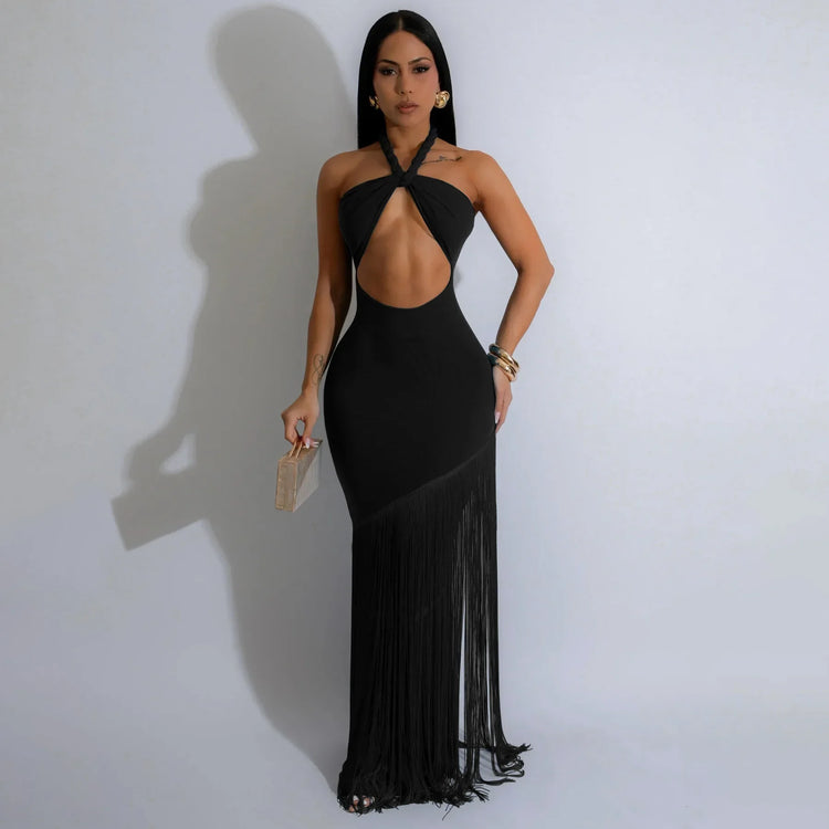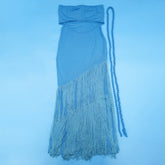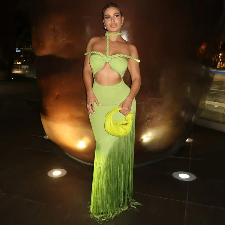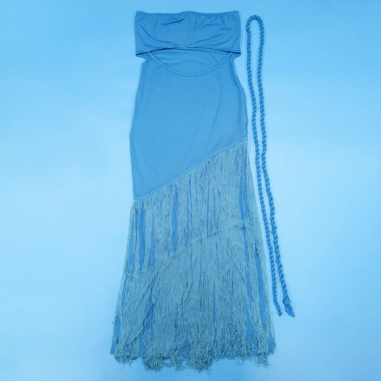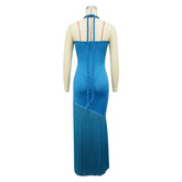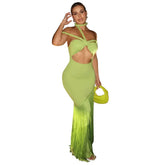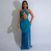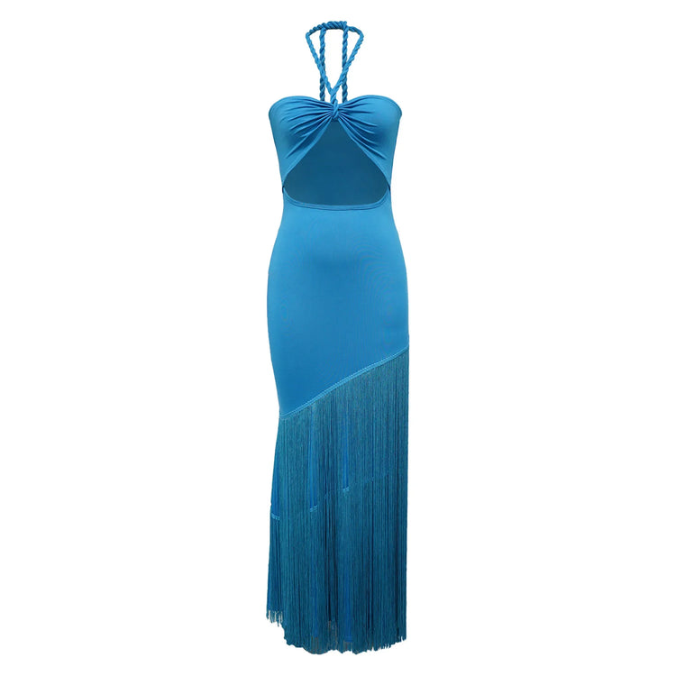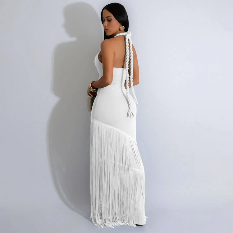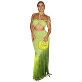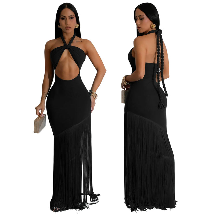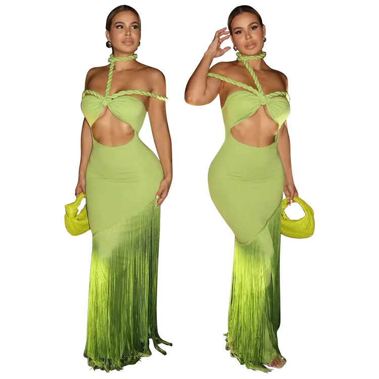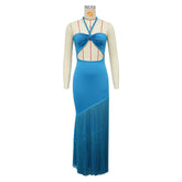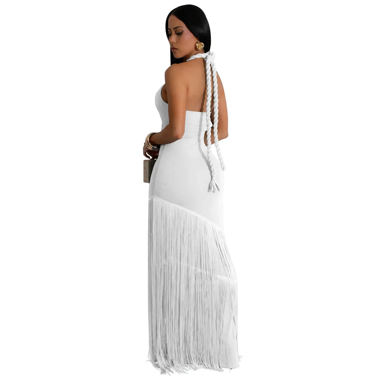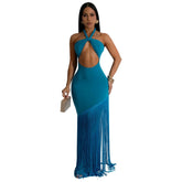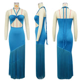 Summer Trendy Tassel Splice Wrap Dress Empire Waist Ankle-Length Sleeveless Hanging Neck Style Women's Dress New Arrival