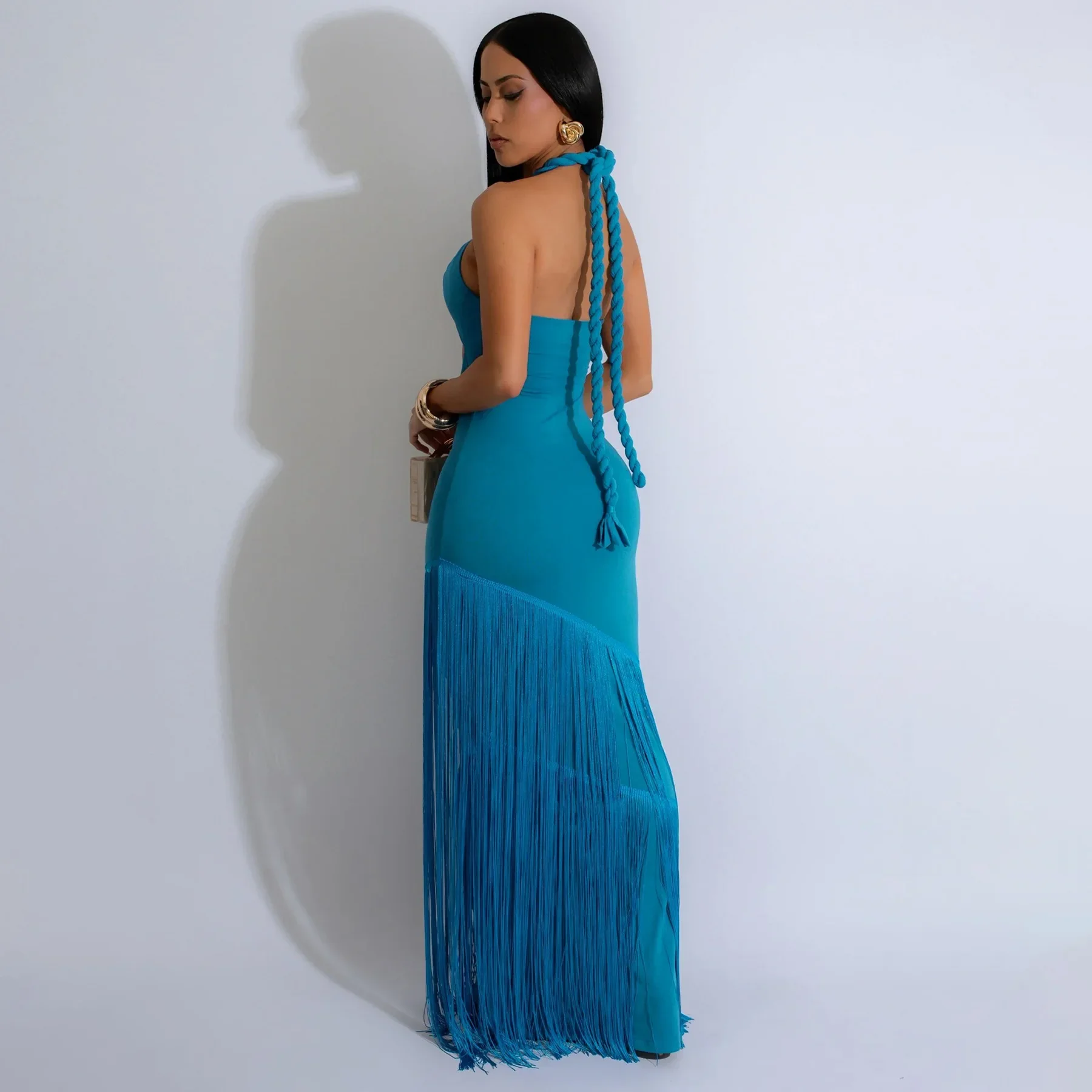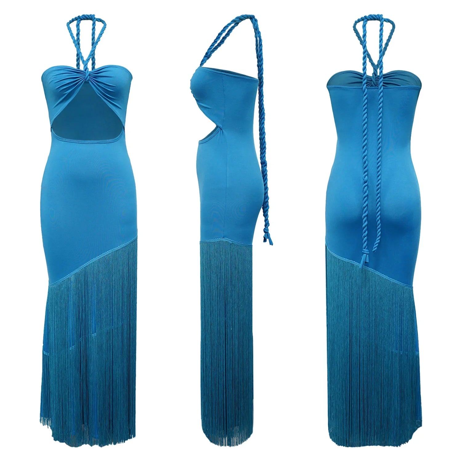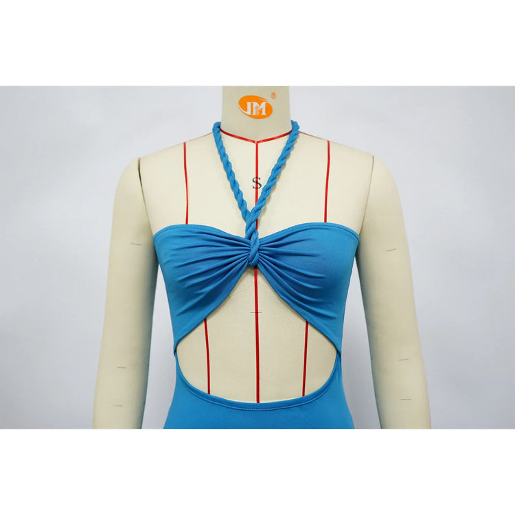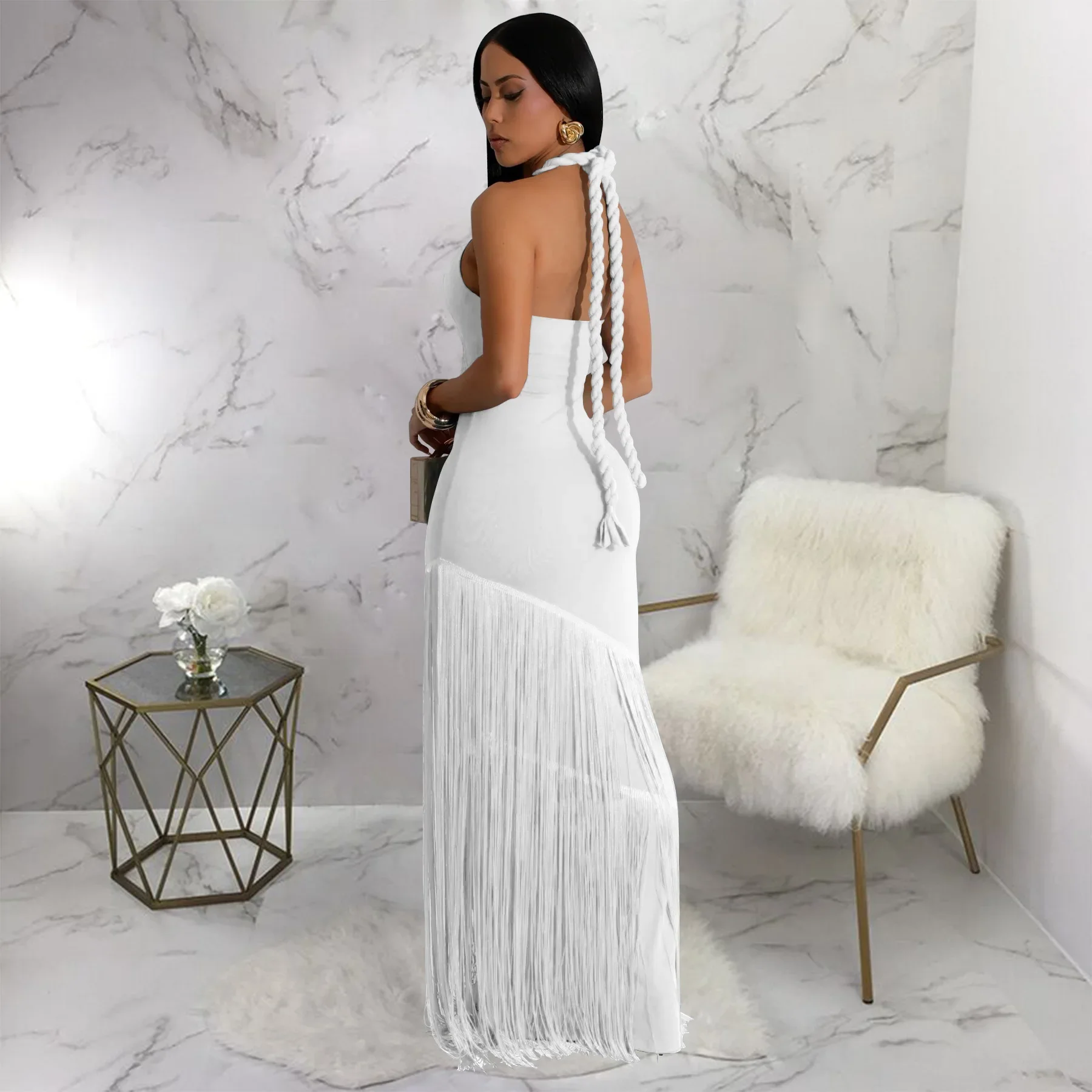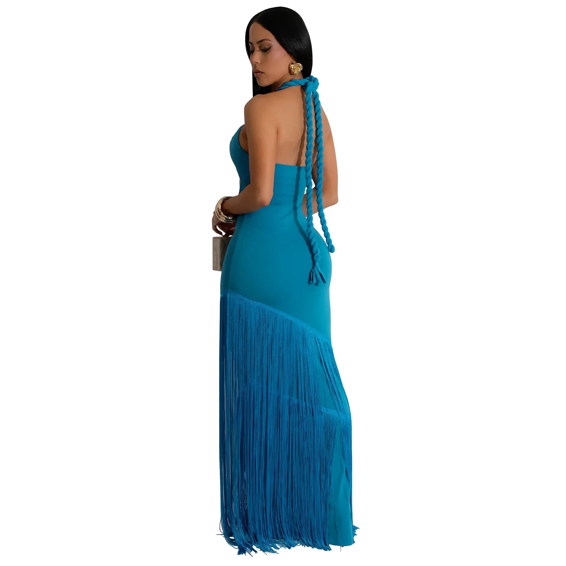 Summer Trendy Tassel Splice Wrap Dress Empire Waist Ankle-Length Sleeveless Hanging Neck Style Women's Dress New Arrival
