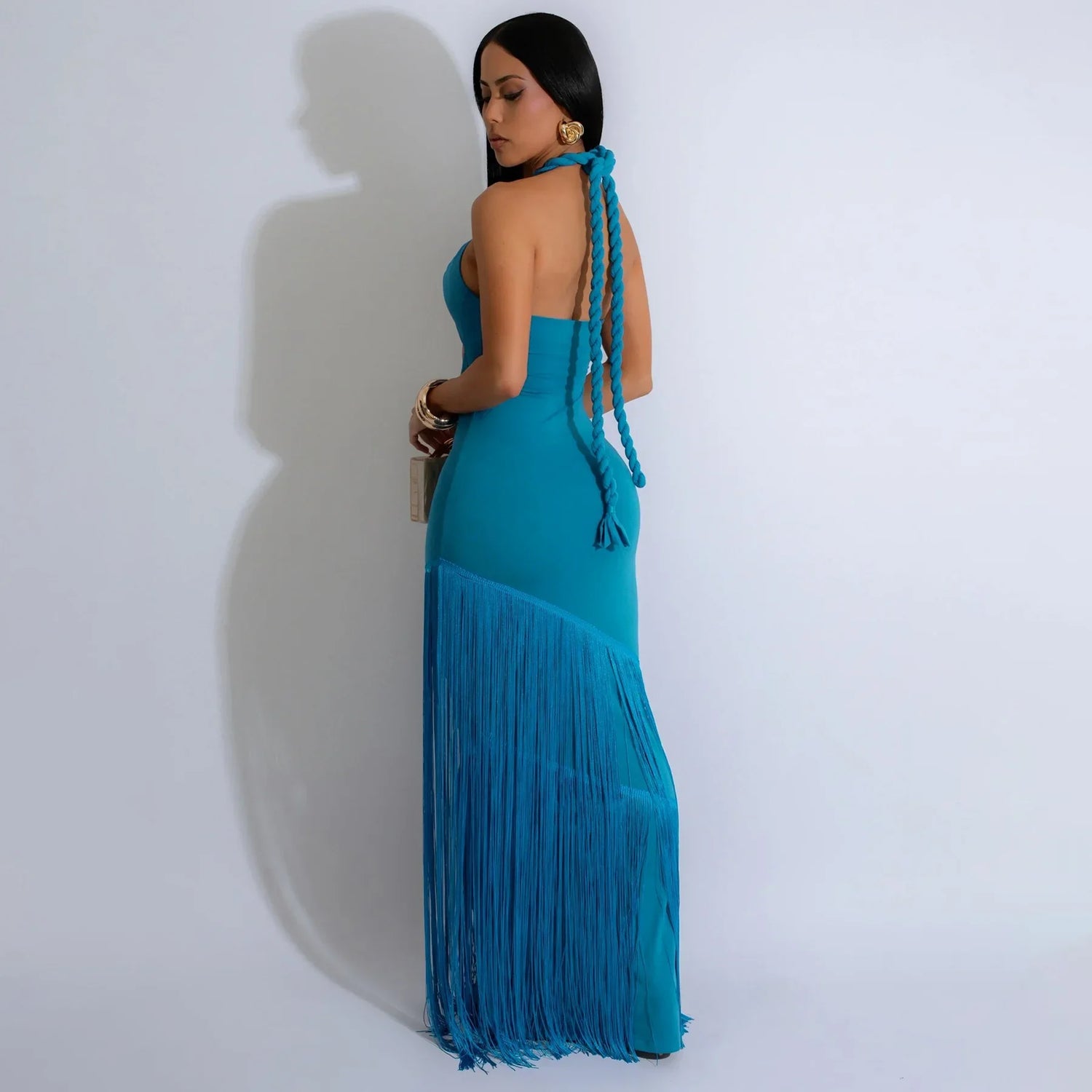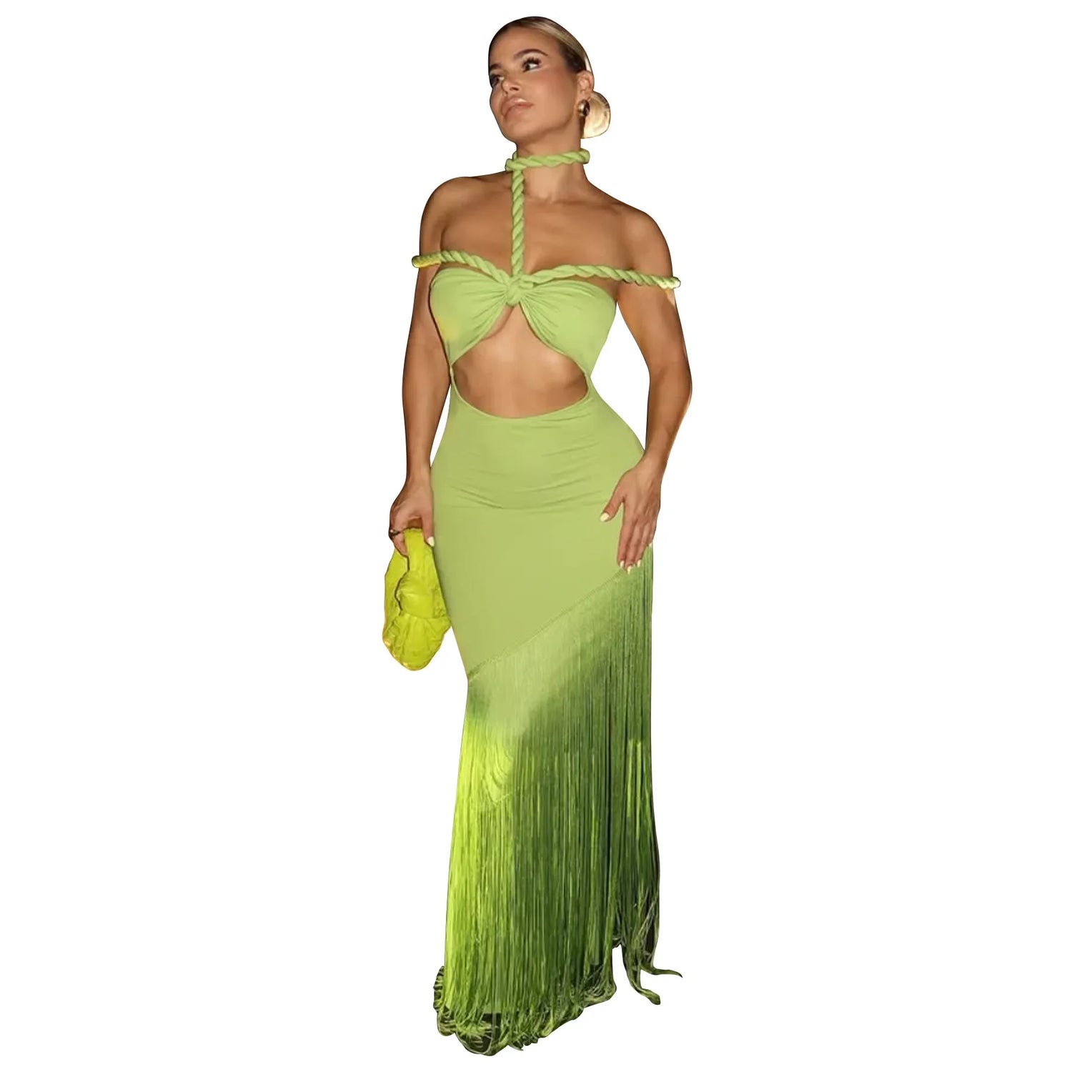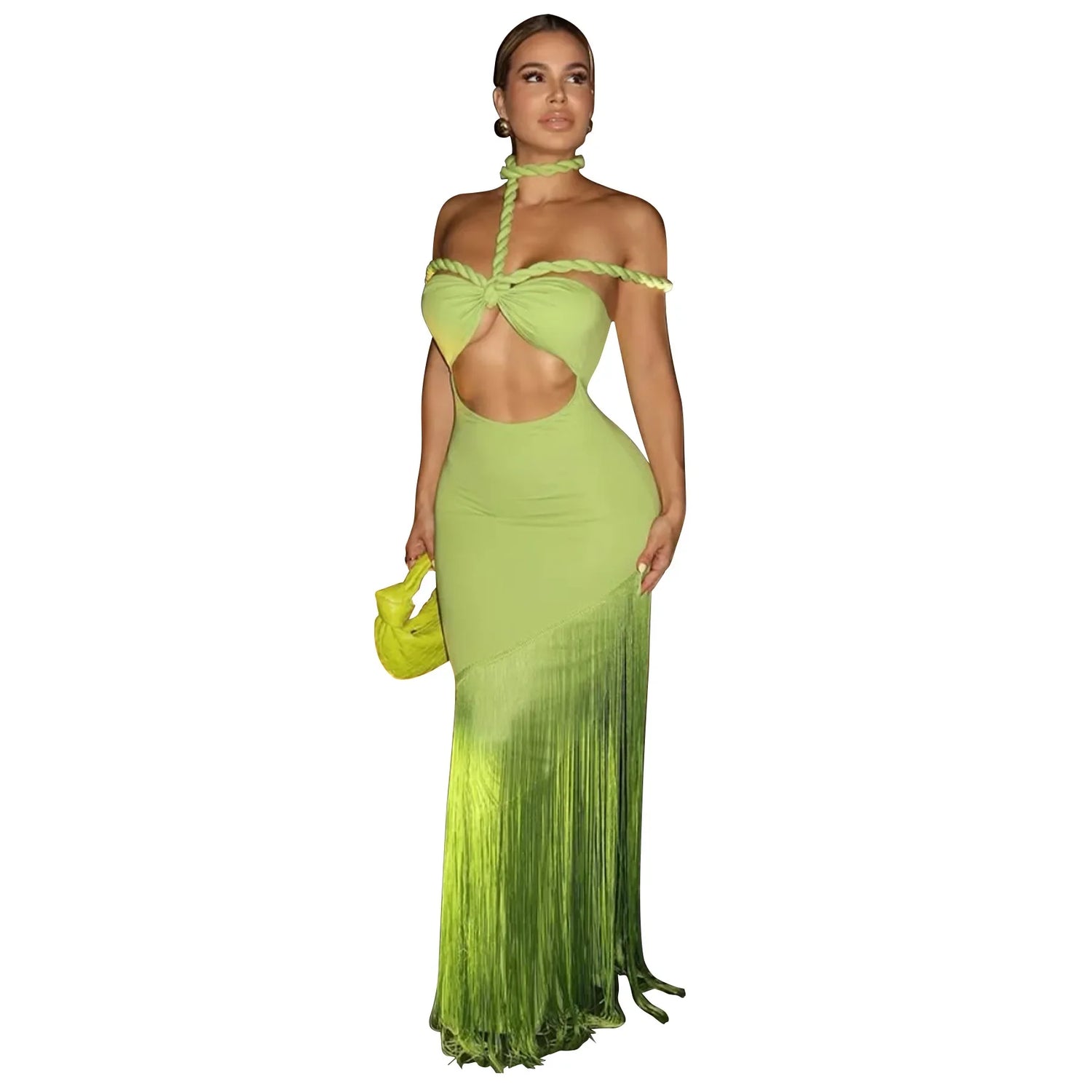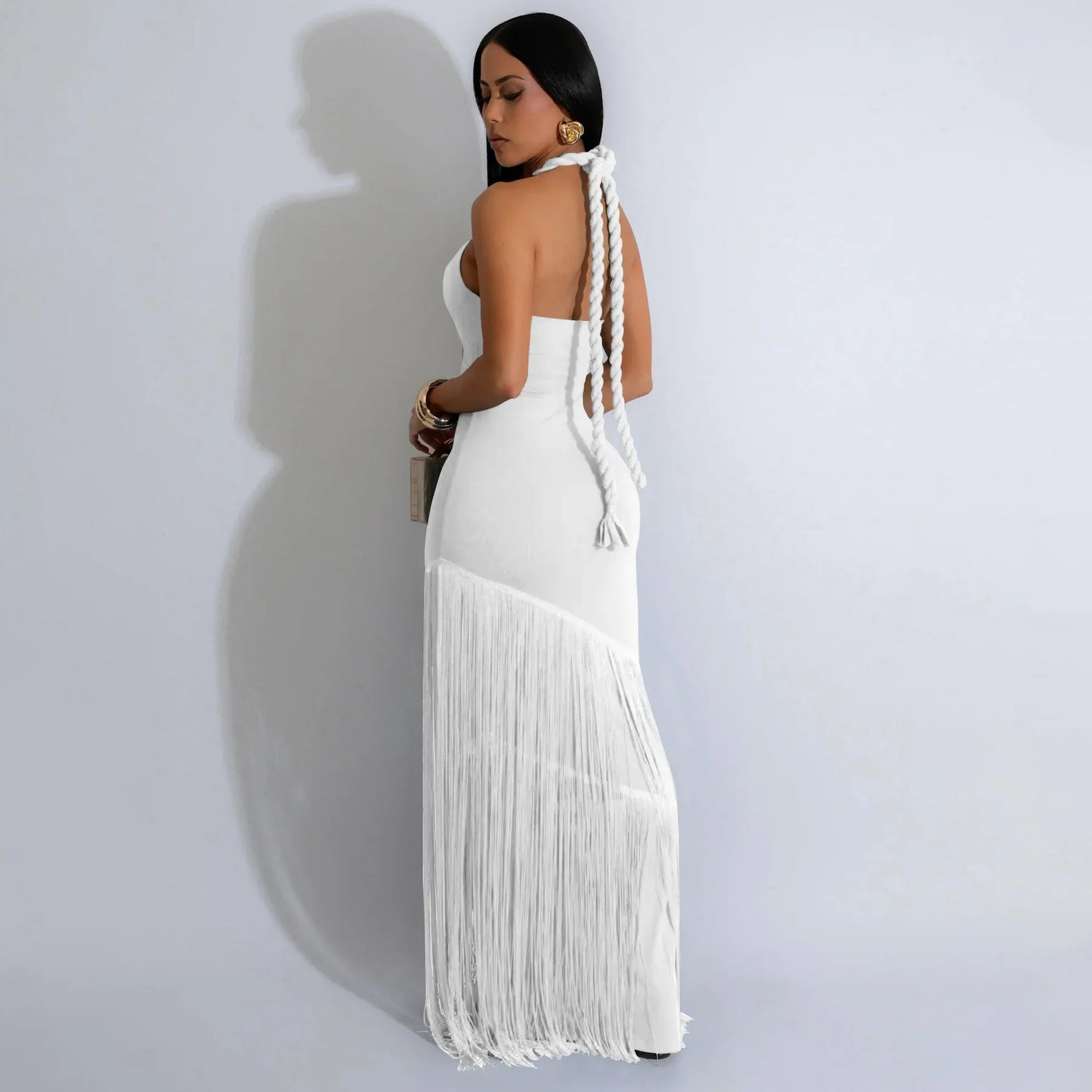 Summer Trendy Tassel Splice Wrap Dress Empire Waist Ankle-Length Sleeveless Hanging Neck Style Women's Dress New Arrival