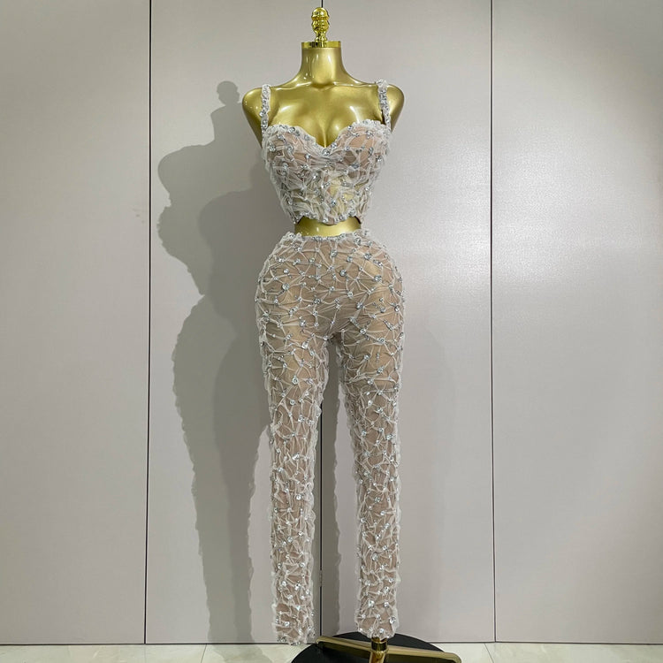 Sexy Sparkly Diamonds Splicing Lace Halter Top+Long Pants Two Piece Set Women Celebrate Birthday Dancer Nightclub Stage Costume