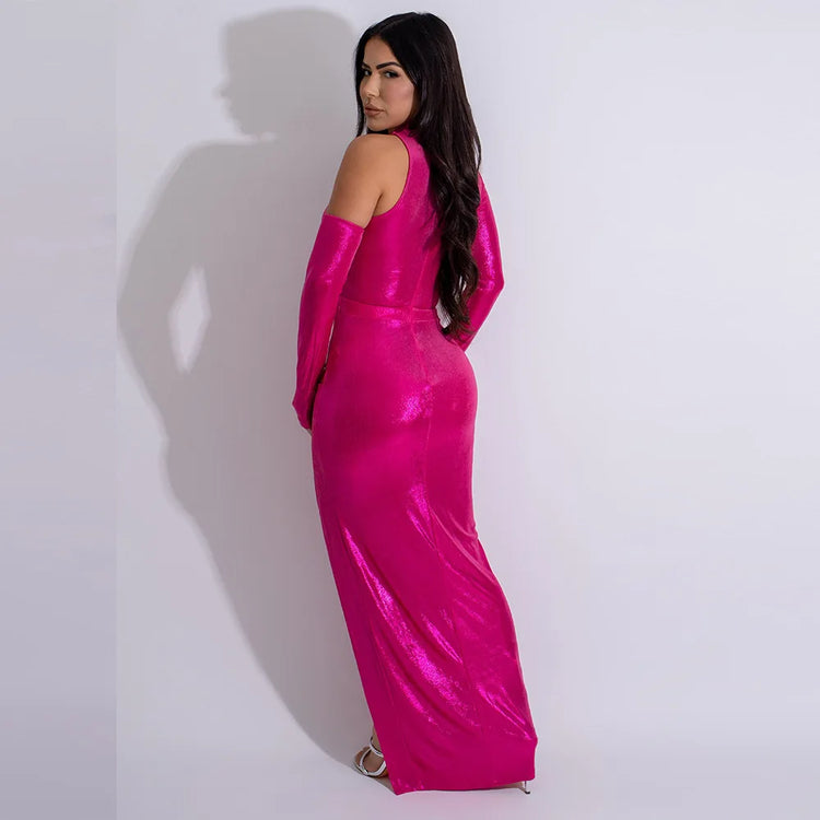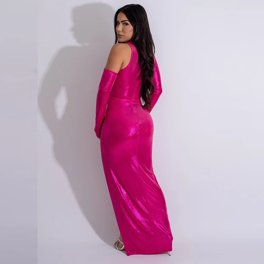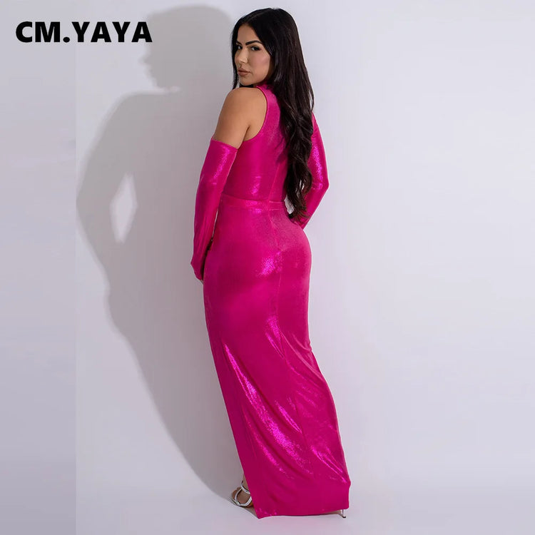 CM.YAYA Women Cutout Shoulder High Side Split Gilding Midi Maxi Long Dress 2025 Club Sexy Prom Party Evening Bodycon Dresses