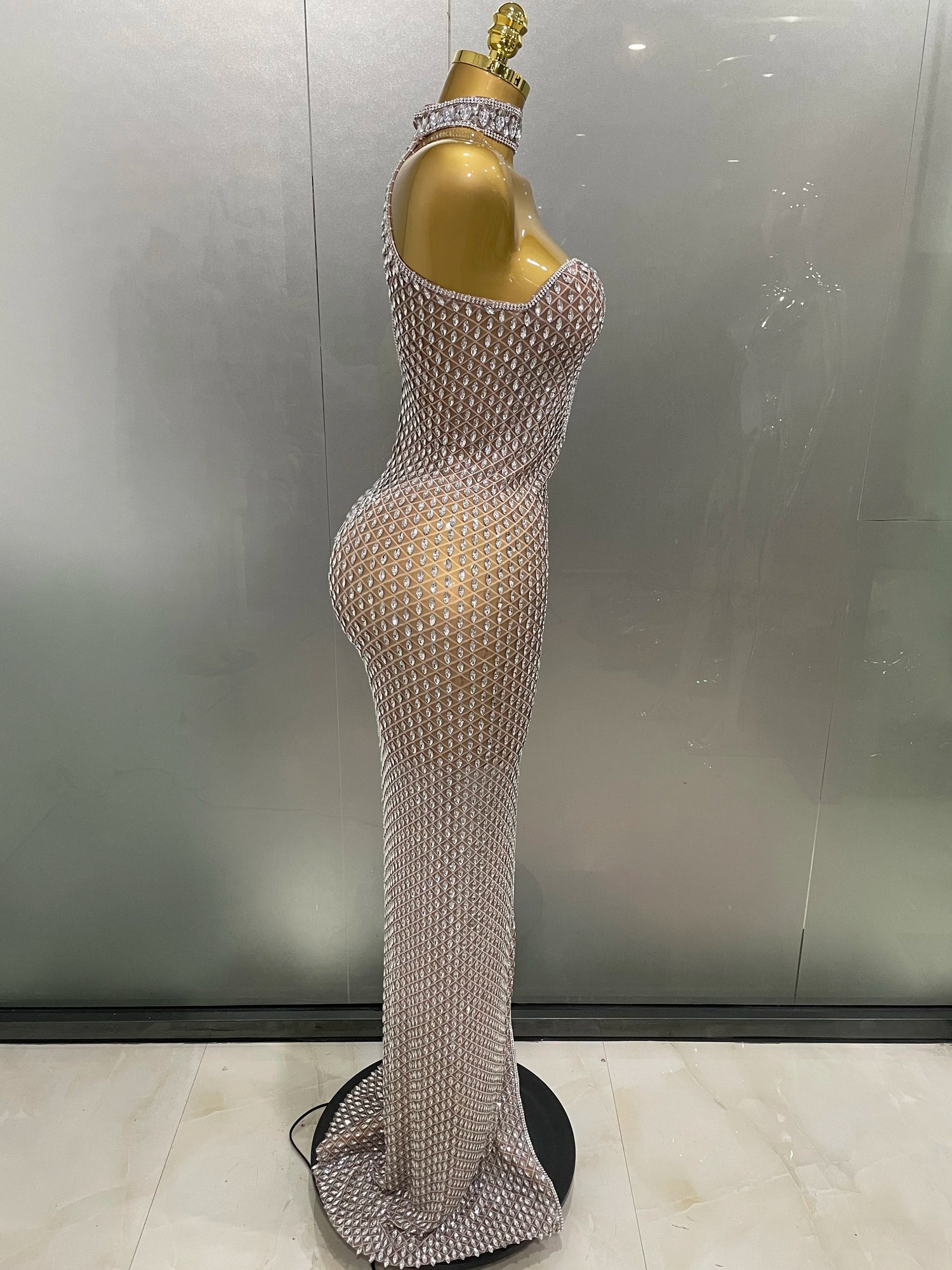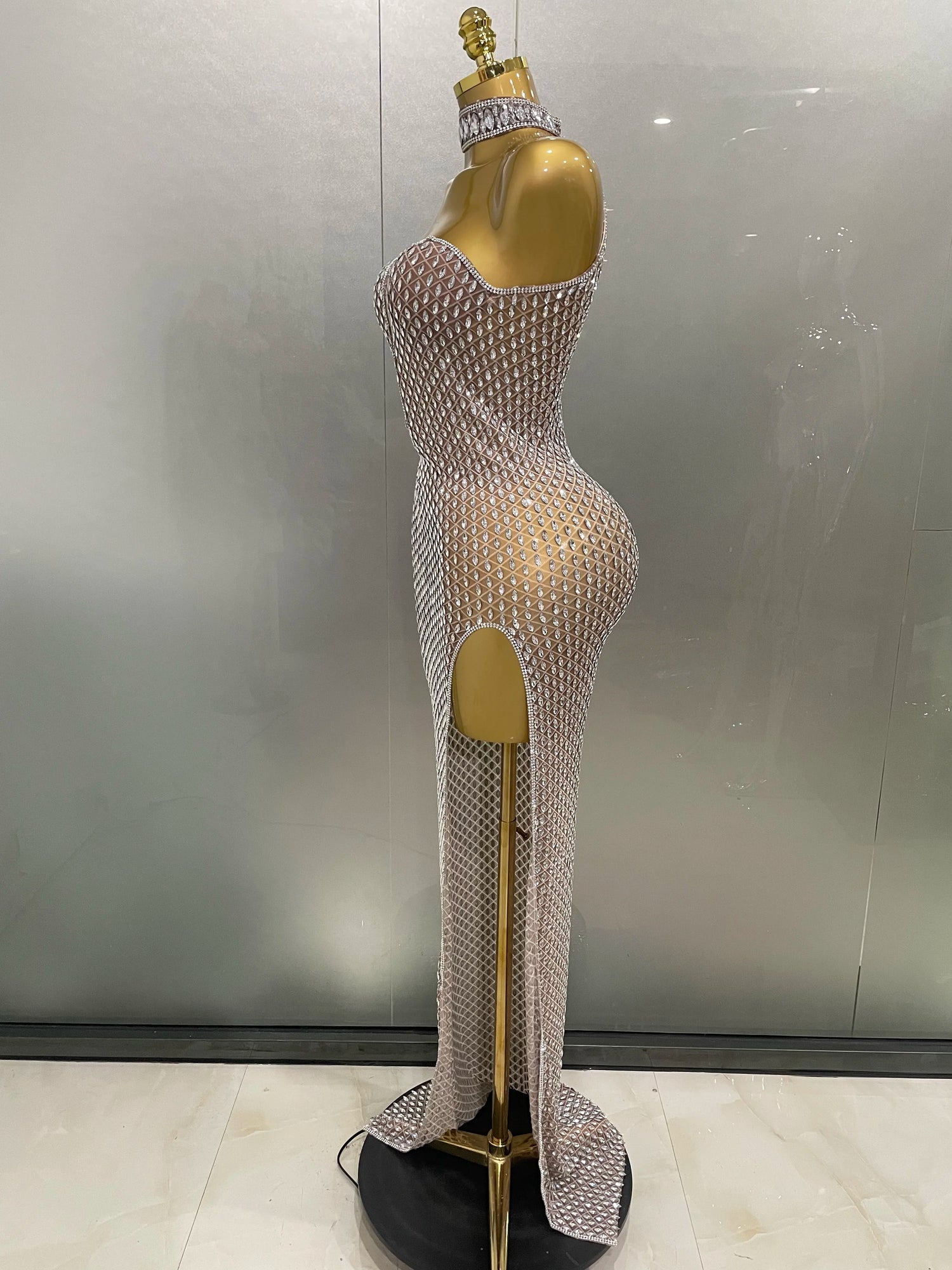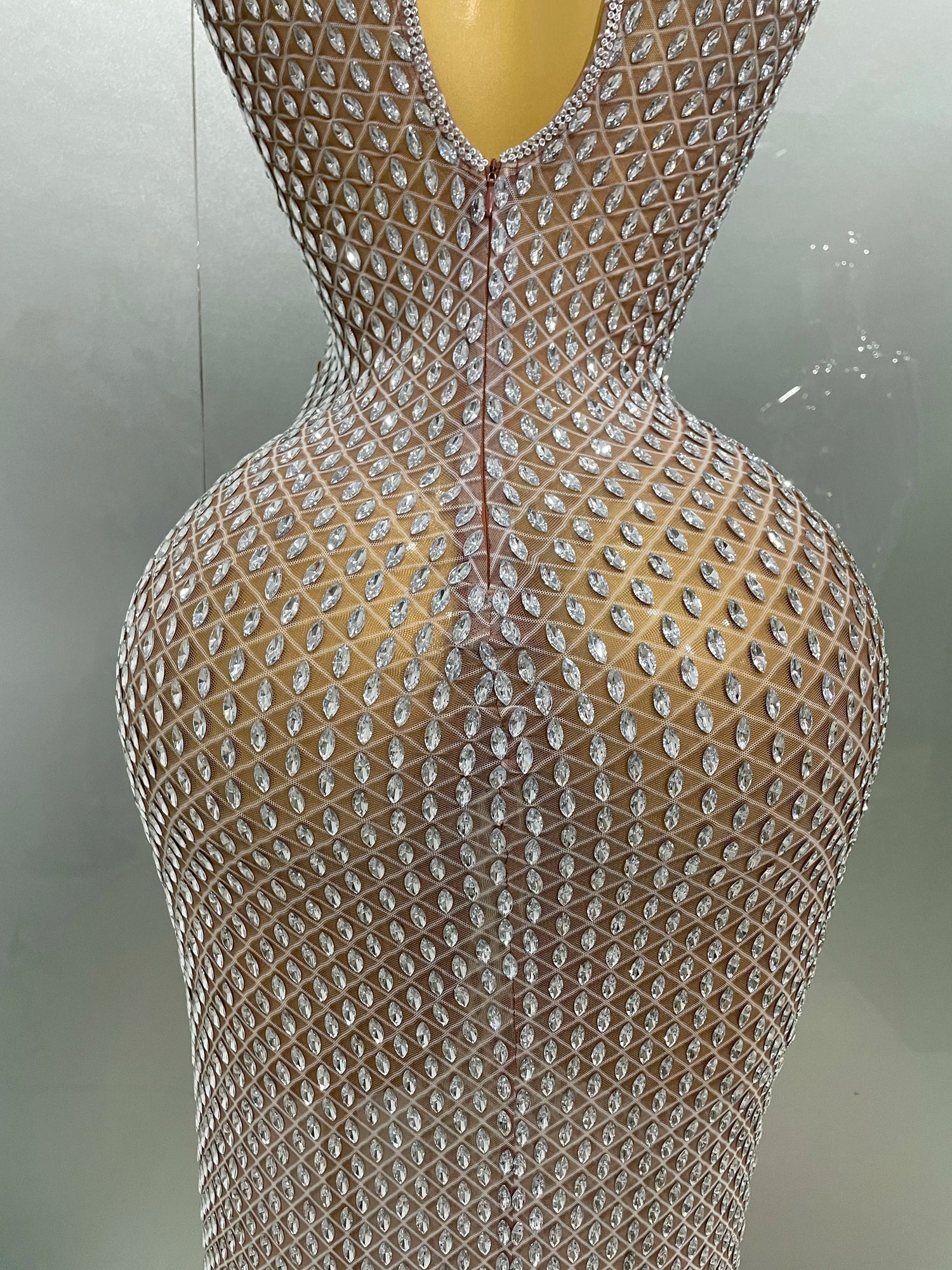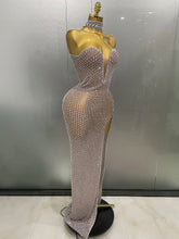 2025 Luxurious Full Rhinestones Mesh Transparent long dress Women Birthday Celebrate Evening Prom Dress party Club Stage Costume