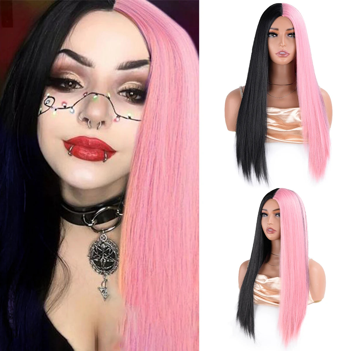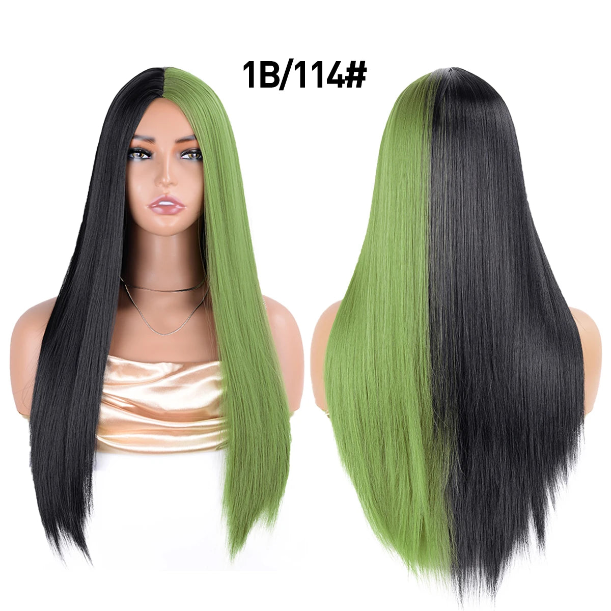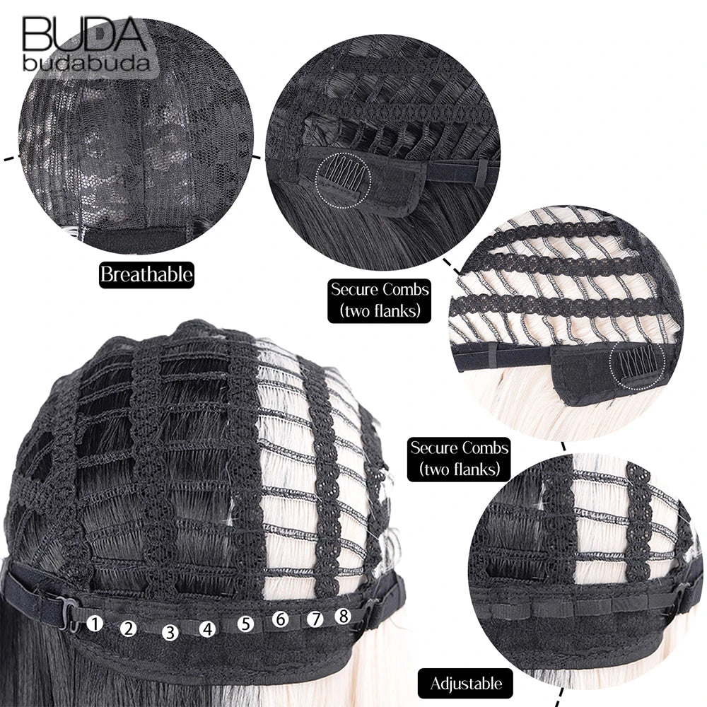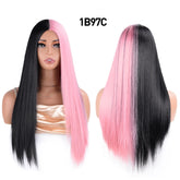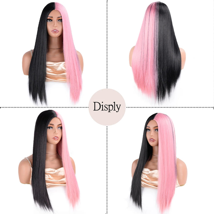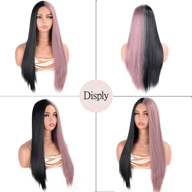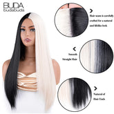 Half Black Half White Two Tone Cosplay Wig Synthetic Long Straight Bicolor Wigs Hair Middle Parting For Women Daily Party buda
