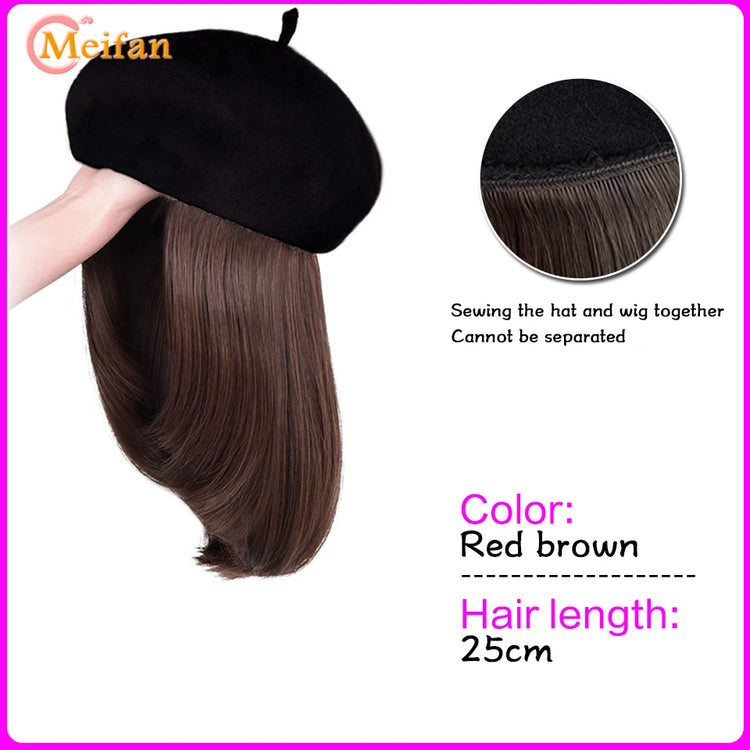MEIFAN Beret Hat Wig Synthetic Short Wavy Curly Hairpiece With Hat Embroidery Berets Cap Wig Hair Extension Black Brown Wig