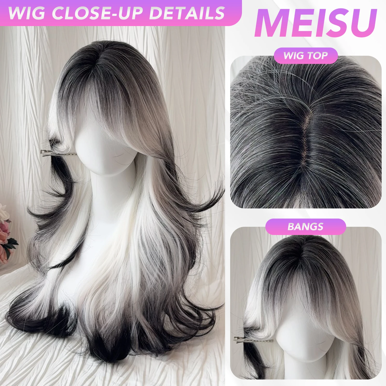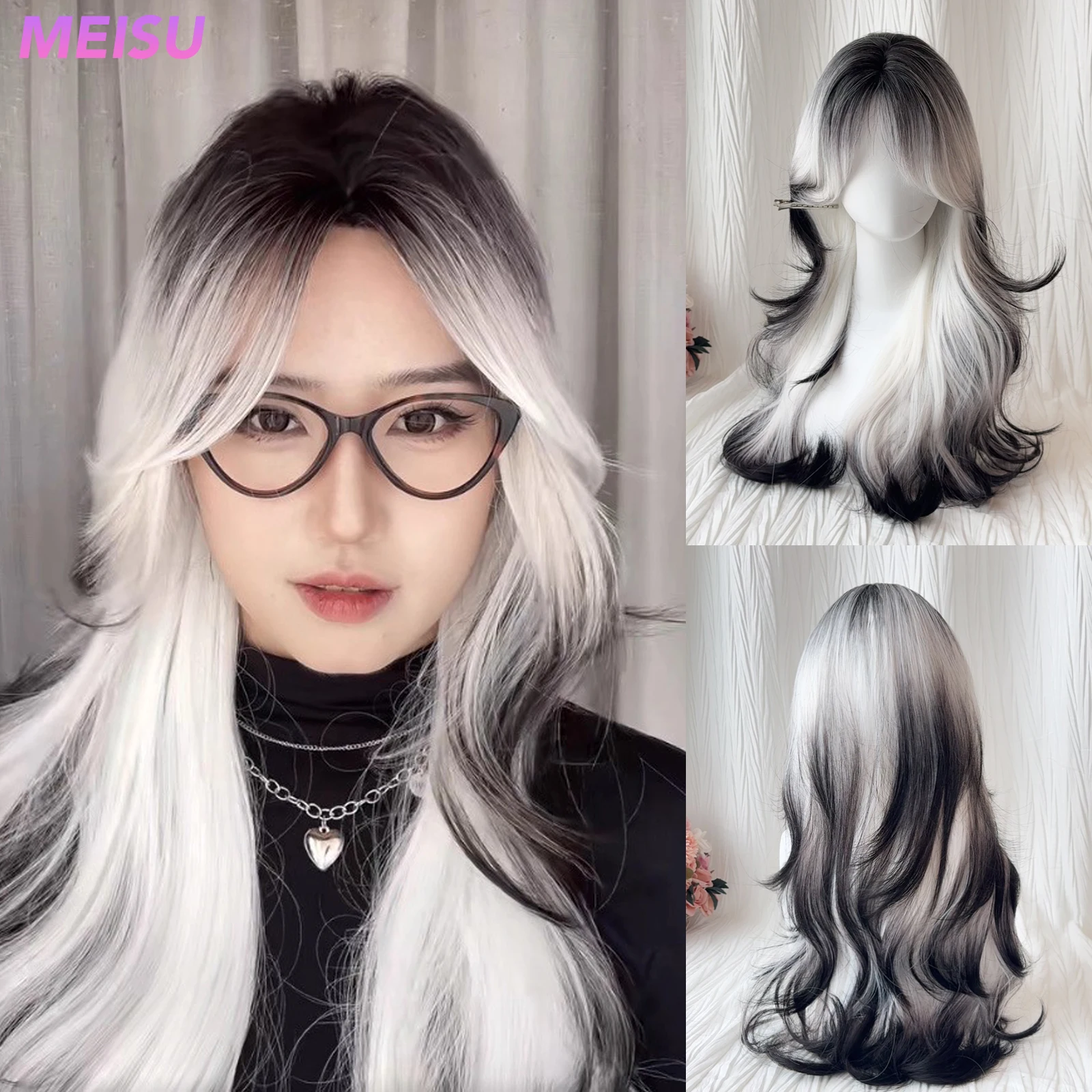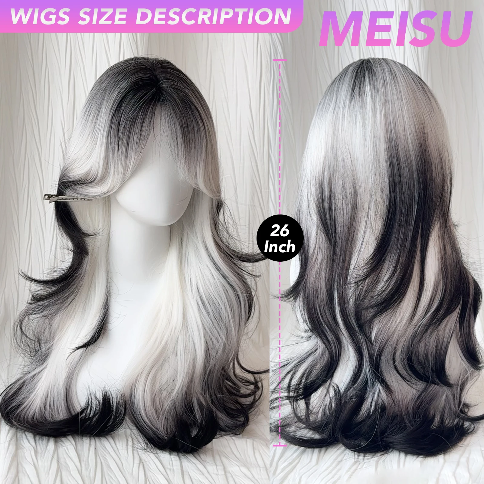 MEISU 26 Inch Synthetic Curly Wave Wigs Air Bangs Hair Black White Heat-Resistant Natural And Smoot Daily Wear For Women