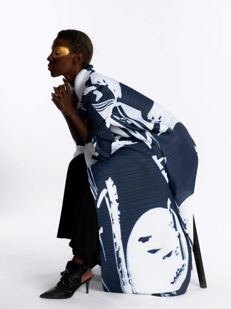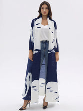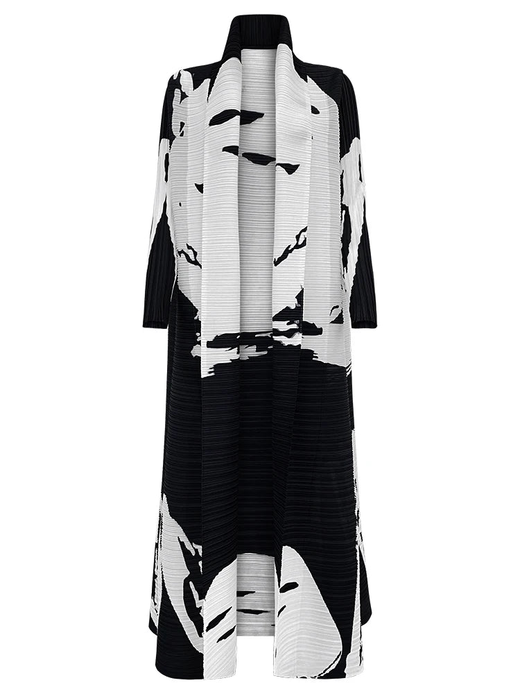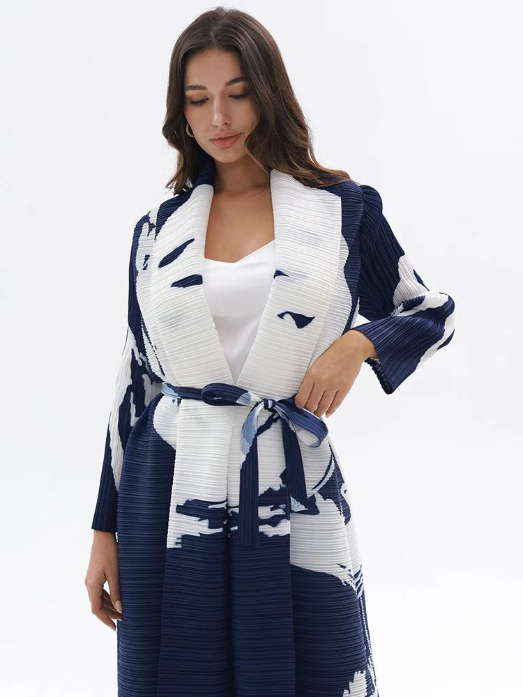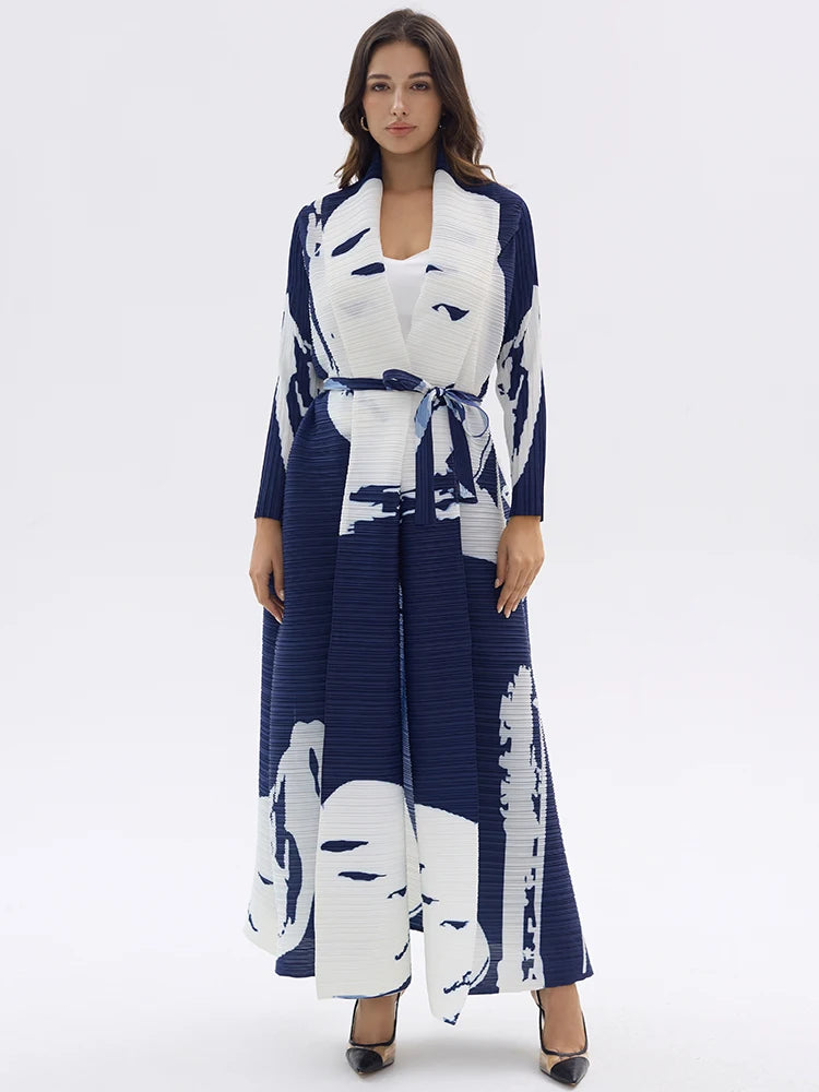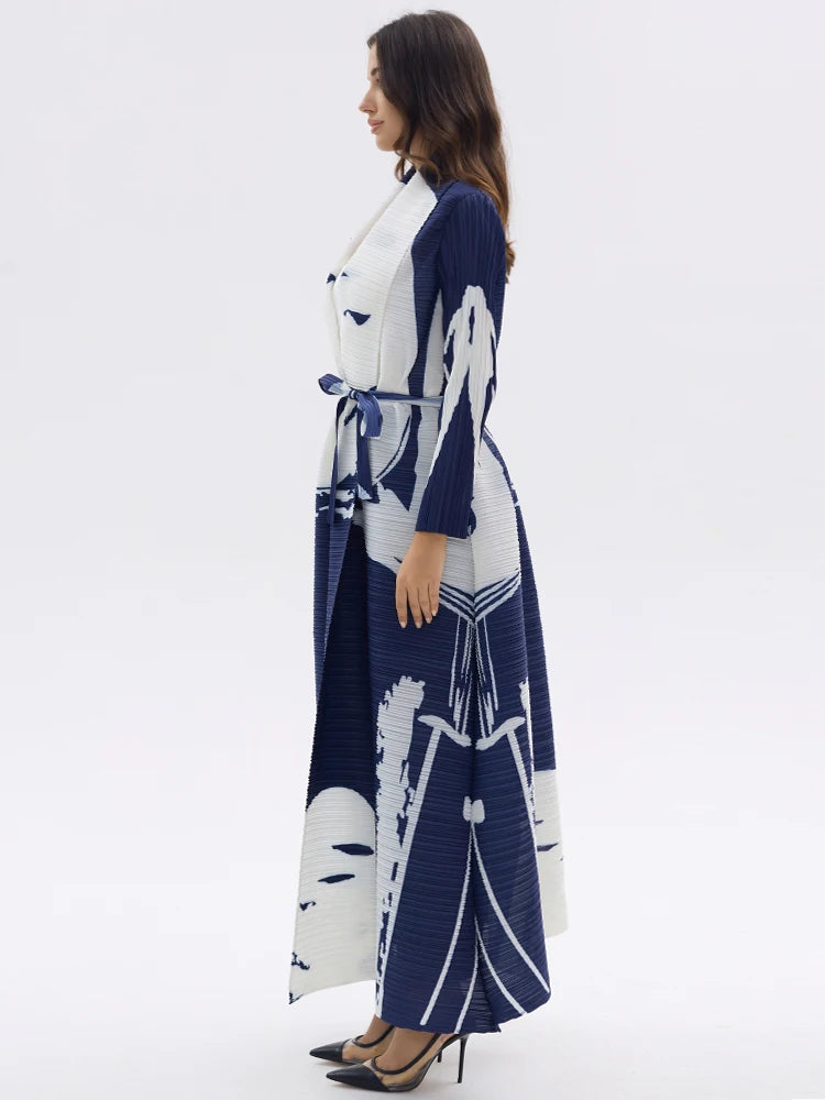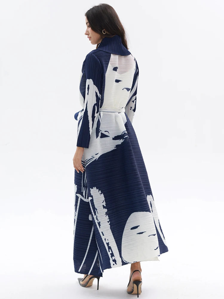 Miyake Pleated Long Sleeve Printed Dress Windbreak Women 2024 Winter New Original Designer Abayas Turndown Collar Belted Coats
