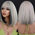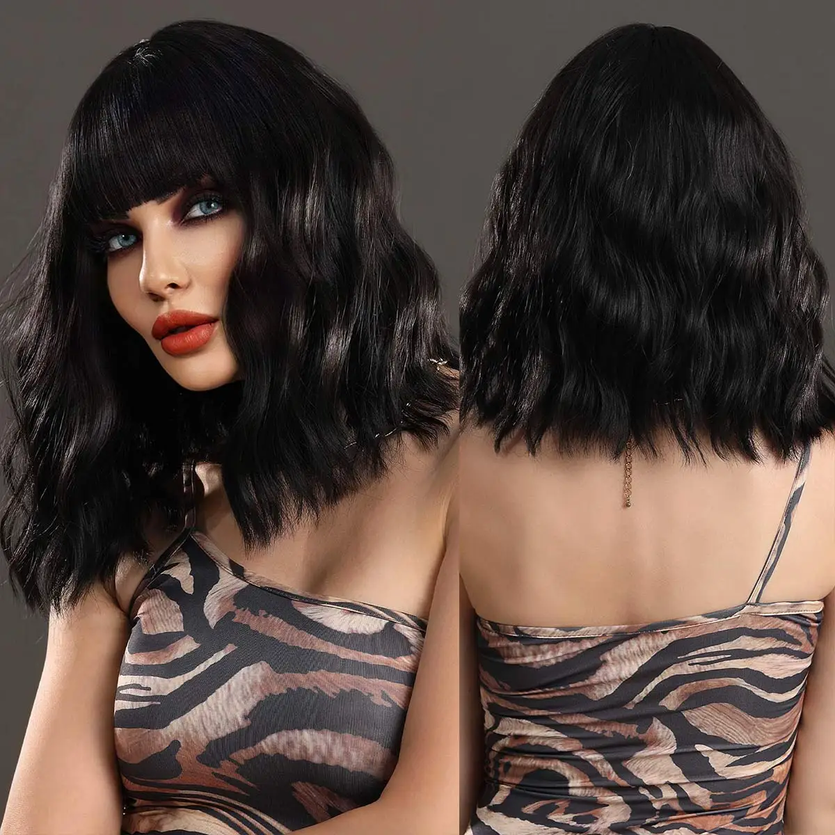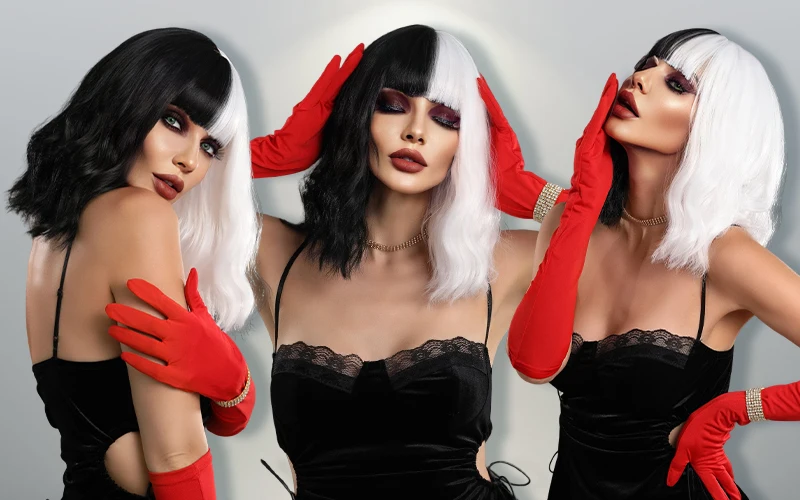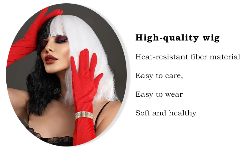 NAMM Halloween Cosplay Wig Synthetic Hair Wig Black with White Natural Bob Wavy Wig with Bangs Cruella Devil Wigs for Women Use