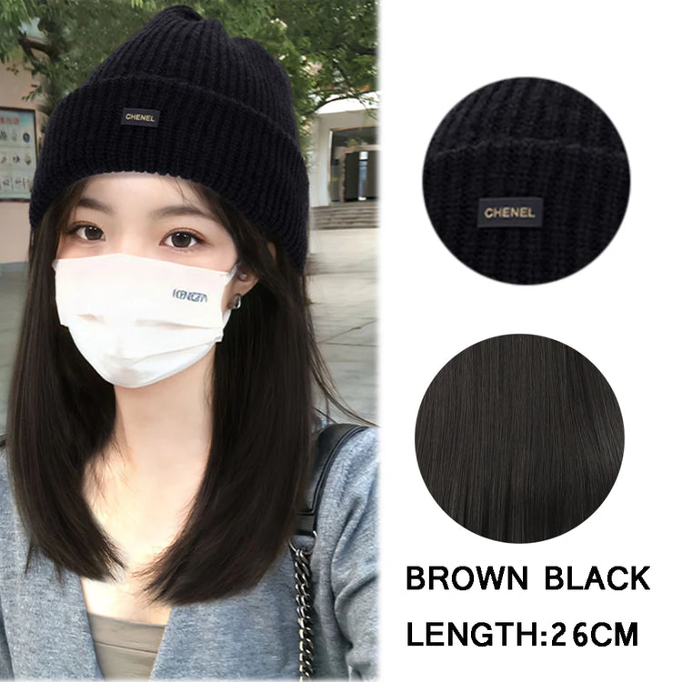 Off White Hat Wig Beanies Hat With Hair Wigs For Women Synthetic Short Straight Hair Warm Ski Plush Knitted Autumn Winter Cap W