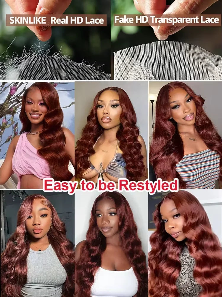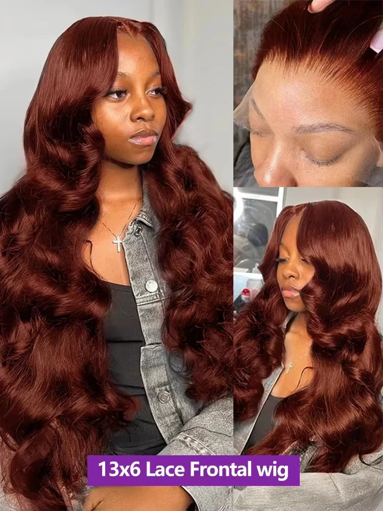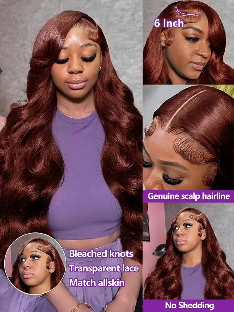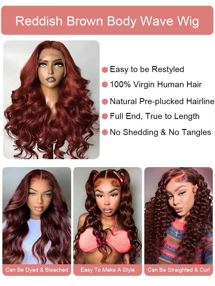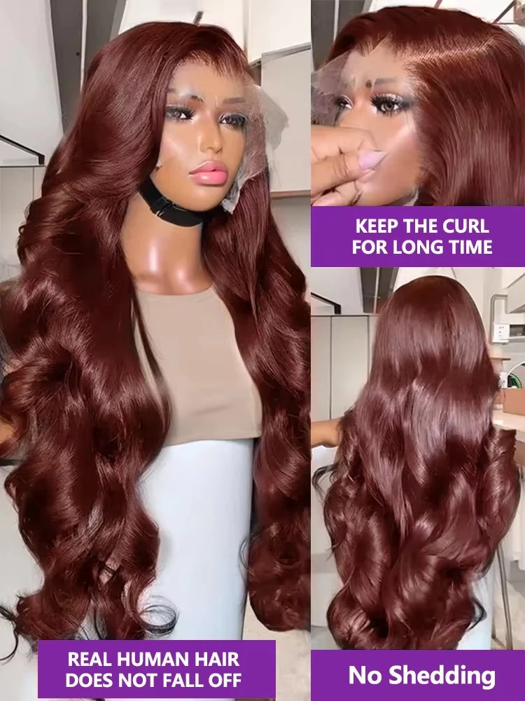 Reddish Brown Body Wave 13x6 HD Transparent Lace Frontal Human Hair Wigs Colored Lace Frontal Wig Preplucked Natural Water Wave