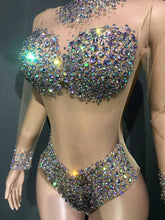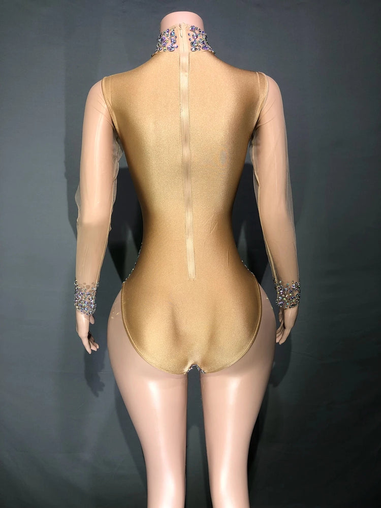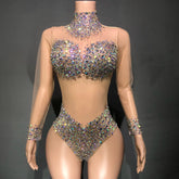 Sparkly AB Rhinestones Bodysuit Sexy Mesh See Through Dance Costume Performance Leotard Women Nightclub Outfit Dancer Stage Wear