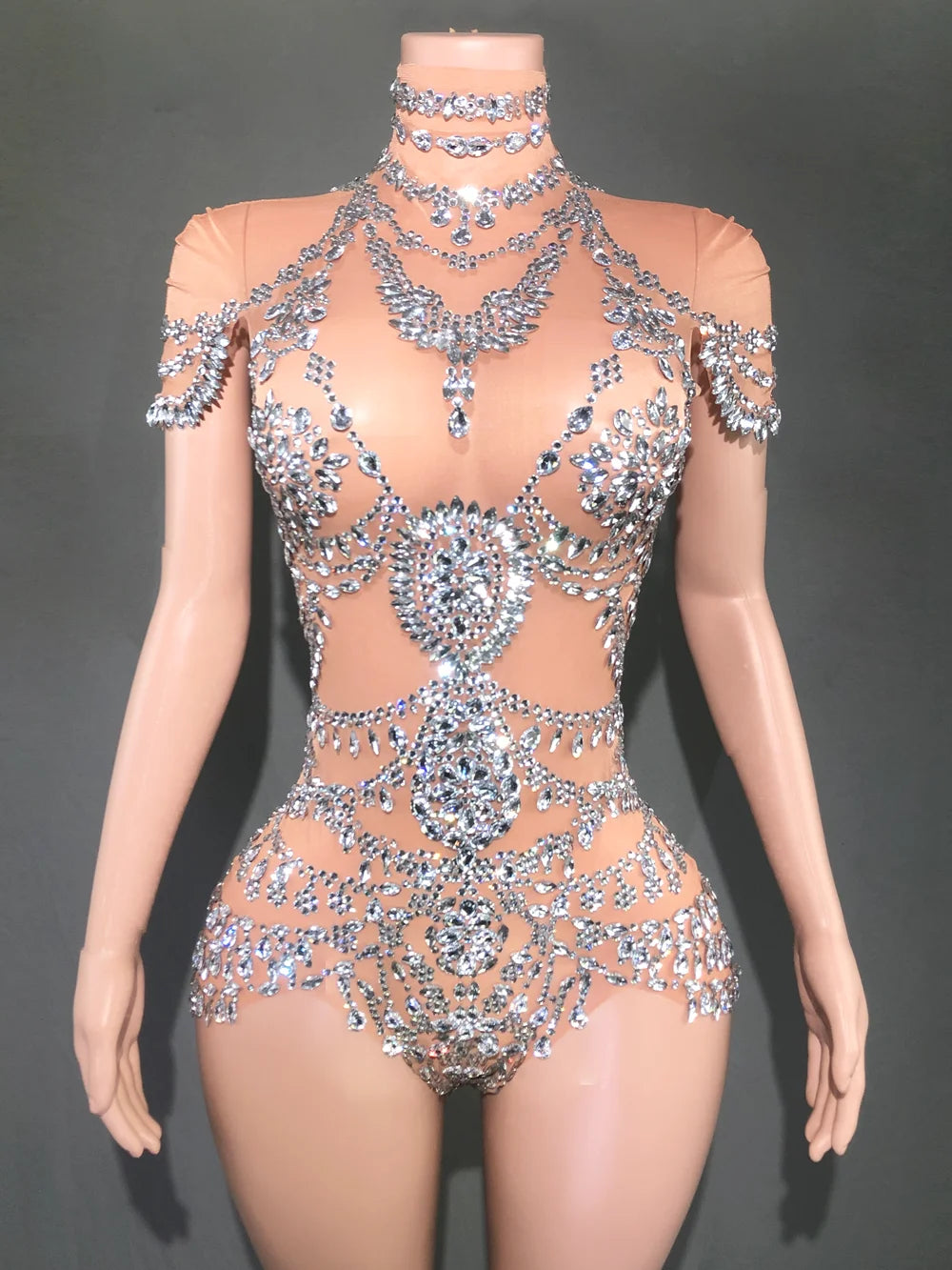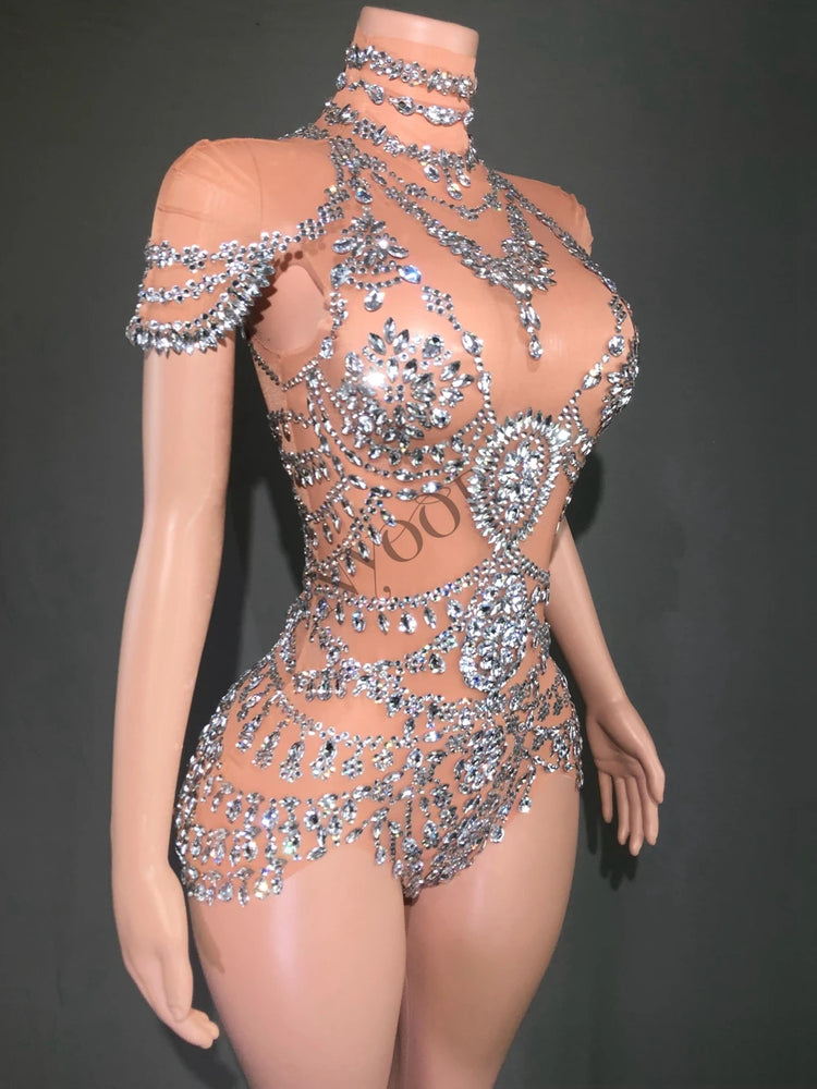 Sparkly Rhinestones Bodysuit for Women Sexy Mesh Transparent Performance Dance Costume Singer Dancer Show Stage Wear