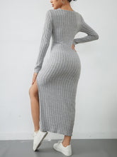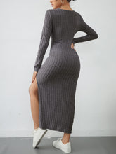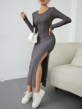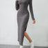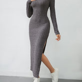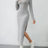Stylish Solid Ribbed Split Dress - Elegant Women's Long Sleeve Crew Neck Dresses for Everyday Wear - Comfortable, Versatile, and Chic Clothing for Ladies