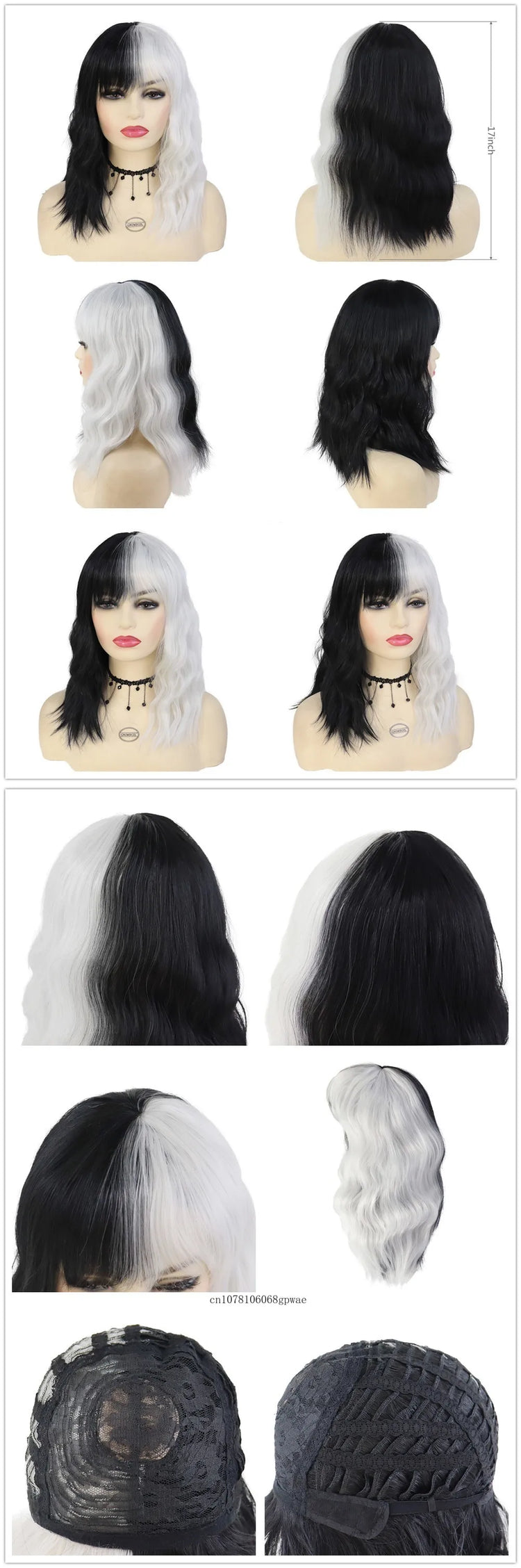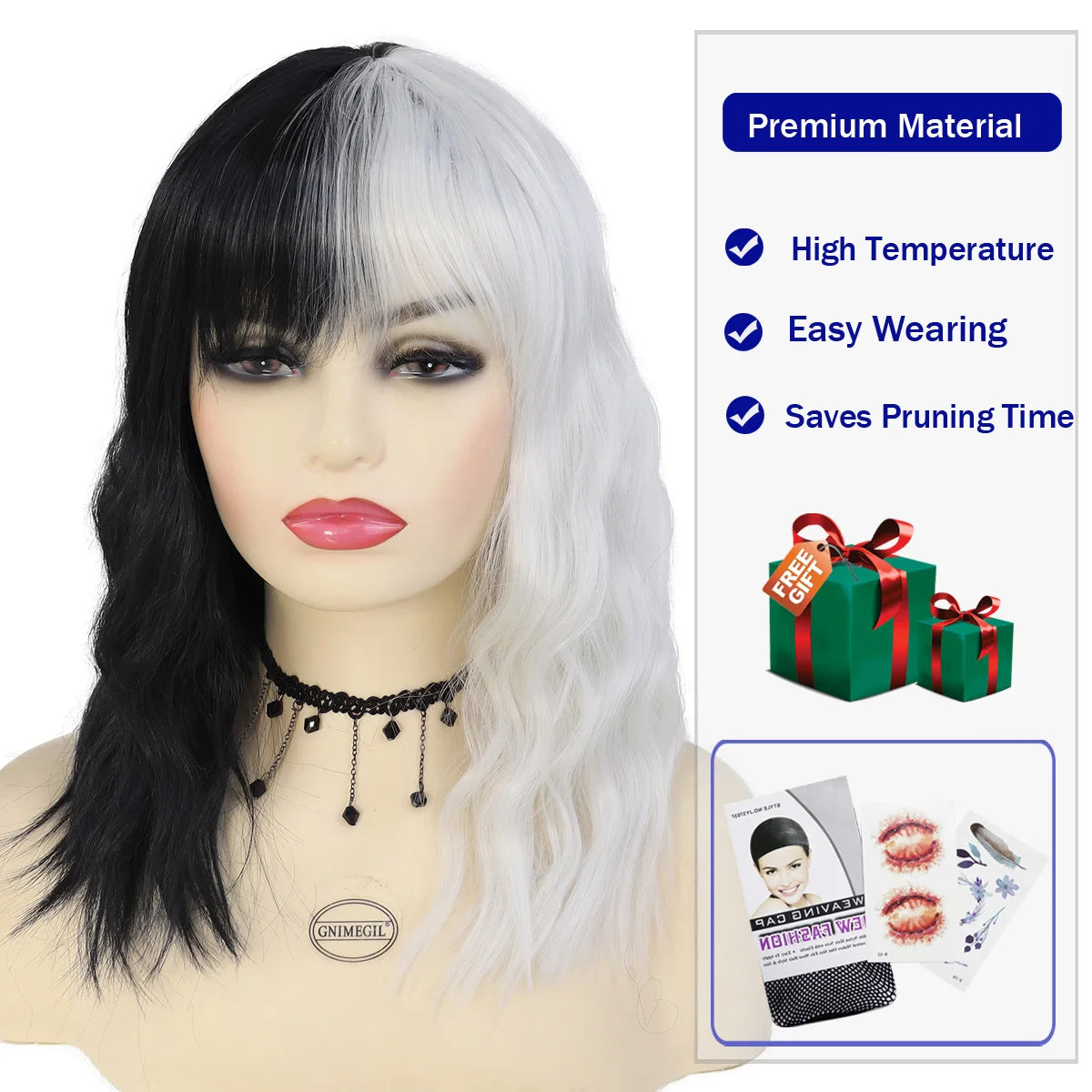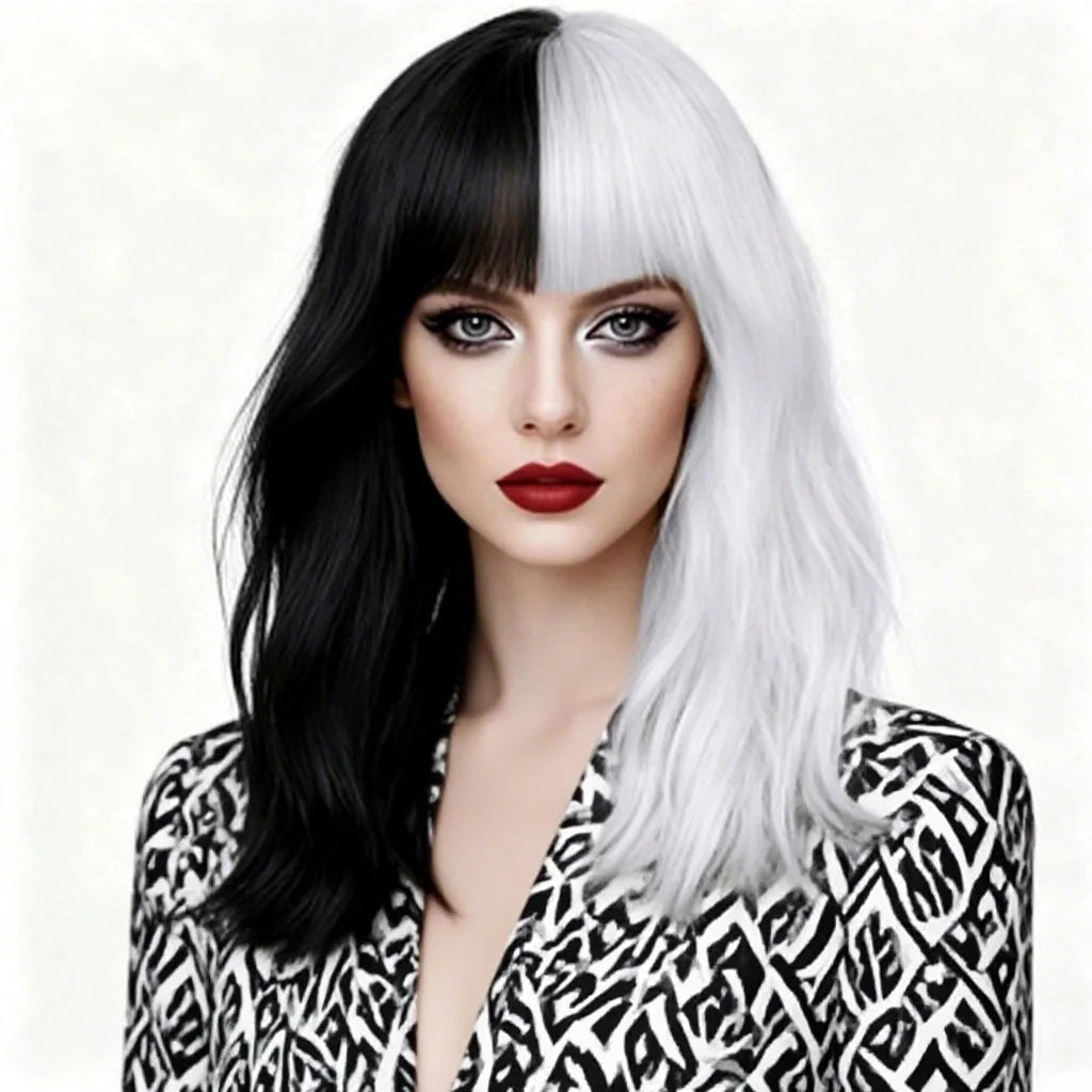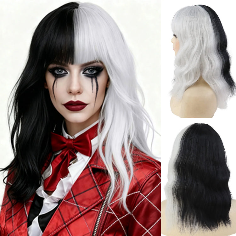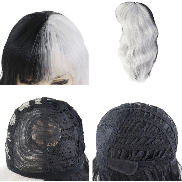 Synthetic Half White Half Black Wigs for Women Lady 17 Inch Long Wavy Wig with Bangs Halloween Cosplay Party White and Black Wig
